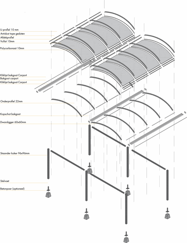 Dankzij de slimme boogconstructie voert het dak regenwater automatisch af naar de zijkanten. Zo blijft de parkeerplek altijd droog en schoon, zonder onderhoud of zorgen. De polycarbonaat platen zijn licht in gewicht maar uitzonderlijk sterk, bestand tegen weer en wind, en laten tegelijkertijd veel daglicht door voor een ruimtelijke uitstraling.