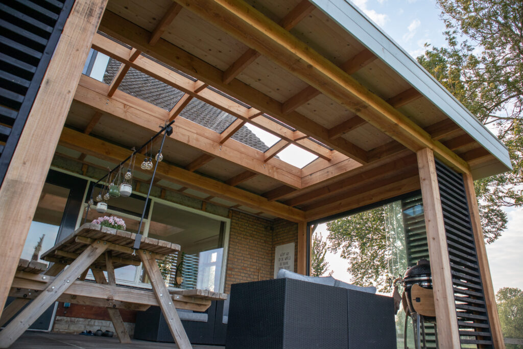 De terrasoverkapping is gemaakt van Douglas hout. De staanders zijn gemaakt van 14 x 14 cm hout. Dit formaat geeft een robuuste look aan het geheel. Het dak is bedekt met EPDM, zodat het hemelwater niet in contact komt met het hout. Om het geheel op een nette manier af te werken wordt er een aluminium daktrim bevestigd.