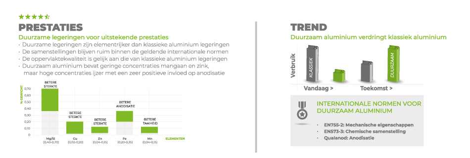 X-ECO aluminium bestaat uit zo’n hoog mogelijk concentratie aan gerecycled aluminium. Hierdoor is er minder uitputting van natuurlijke grondstoffen en fossiele brandstoffen, is er minder CO2-uitstoot door gebruik van hernieuwbare energie en minder transport. Dit resulteert dat het aluminium legeringsrijker en duurzamer is met dezelfde eigenschappen als klassiek aluminium. Ons producent van aluminium is al meer dan 10 jaar koploper op het gebied van hoogwaardig en duurzaam aluminium.