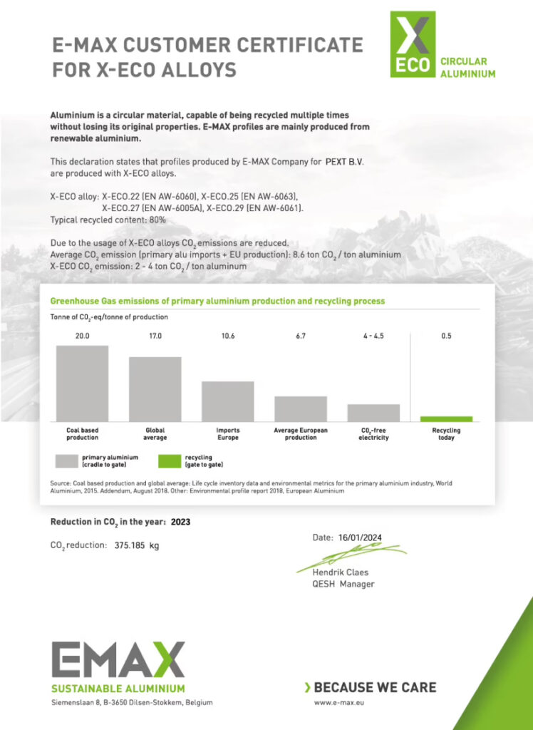 Het gebruik van duurzaam aluminium is niet vastgelegd en verplicht in de wet- en regelgeving. Toch voelt Pext zich verantwoordelijk om bij te dragen aan een duurzamere wereld. Door als producent van hybride lichtdoorlatende overkappingssytemen de Carbon footprint te verlagen, dragen wij bij aan een circulaire economie. Dit is de reden waarom Pext gebruik maakt van X-ECO aluminium.